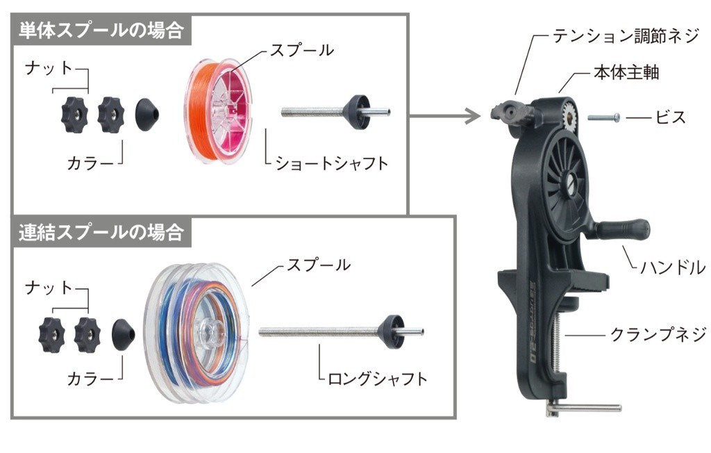配備捲線盤和連接捲線盤用的長短2種傳動軸。