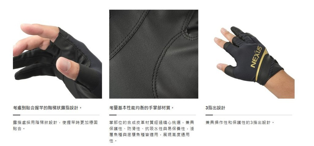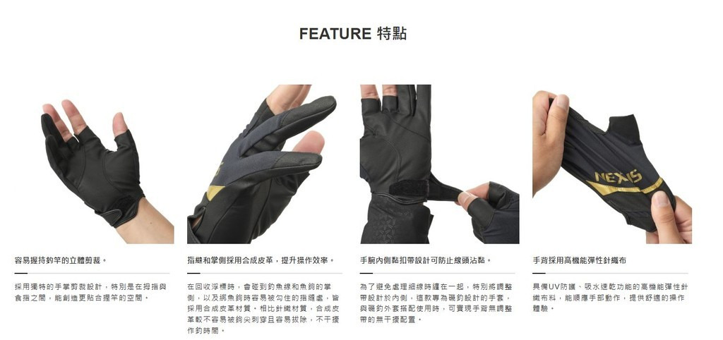 適合磯釣的立體設計,不易沾黏線頭的內側黏扣帶設計,具備UV防護、吸水速乾功能的彈性針織布料,適合春天~秋天三季穿戴的NEXUS系列手套。容易被針勾住的掌側和指縫使用的材質由原本的針織布料改為合成皮。相比針織材質,合成皮革較不容易被鉤尖刺穿且好拔除,可減少失誤並提升操作效率。