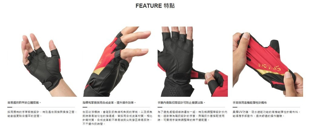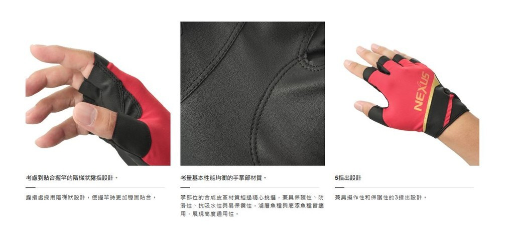 適合磯釣的立體設計,不易沾黏線頭的內側黏扣帶設計,具備UV防護、吸水速乾功能的彈性針織布料,適合春天~秋天三季穿戴的NEXUS系列手套。容易被針勾住的掌側和指縫使用的材質由原本的針織布料改為合成皮。相比針織材質,合成皮革較不容易被鉤尖刺穿且好拔除,可減少失誤並提升操作效率。