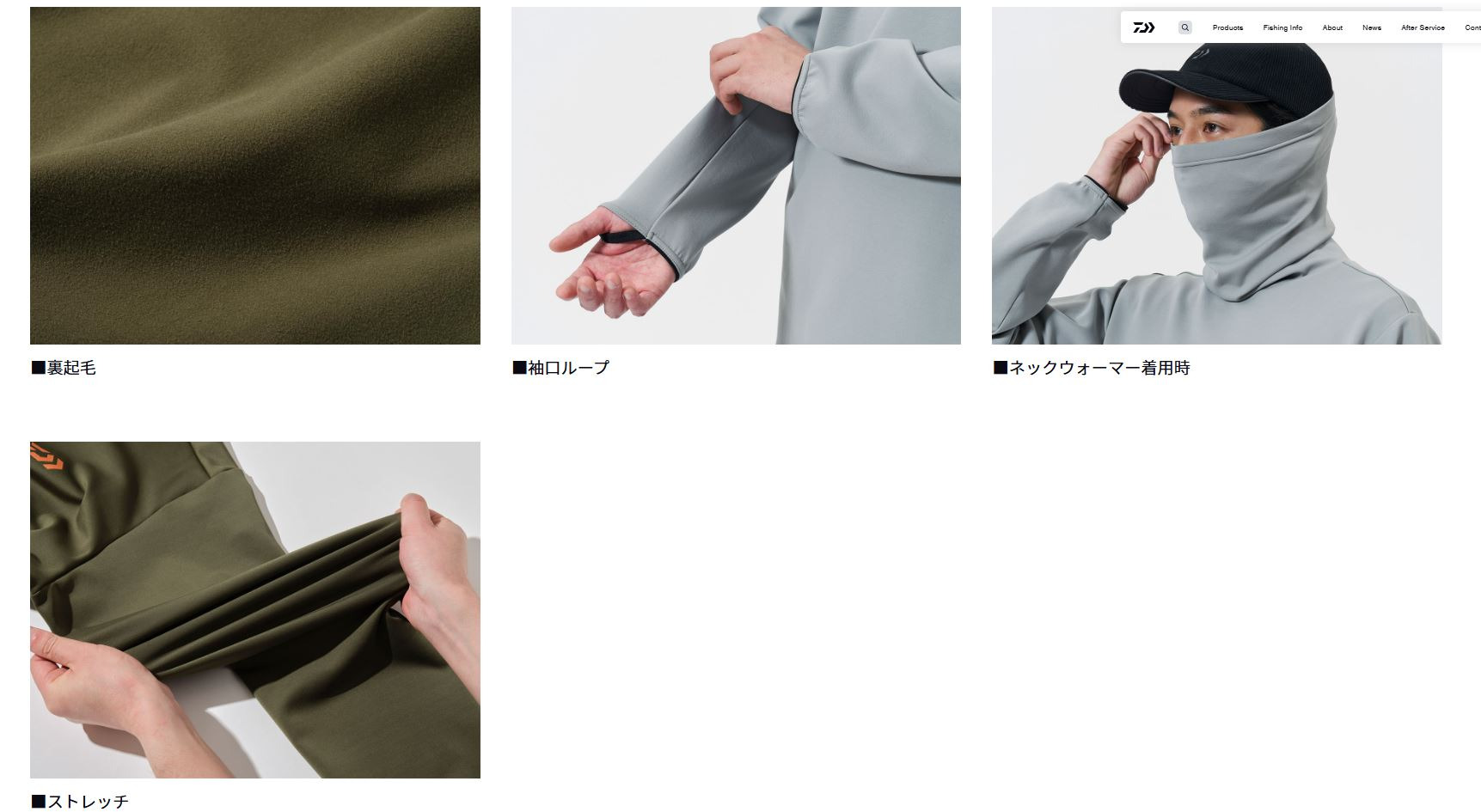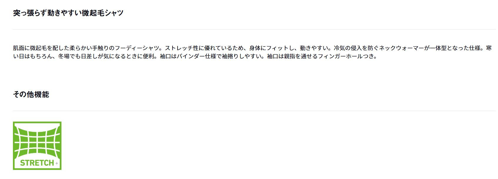 肌面に微起毛を配した柔らかい手触りのフーディーシャツ。ストレッチ性に優れているため、身体にフィットし、動きやすい。冷気の侵入を防ぐネックウォーマーが一体型となった仕様。寒い日はもちろん、冬場でも日差しが気になるときに便利。袖口はバインダー仕様で袖捲りしやすい。袖口は親指を通せるフィンガーホールつき。