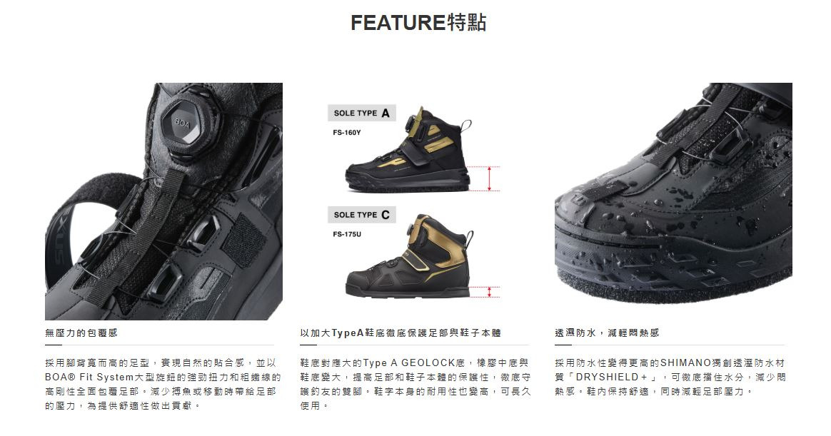 剛性增加的BOA® Fit System旋鈕、具安定感的鞋底形狀、防水透濕的DRYSHIELD+等,機能性十足的磯釣用鞋。