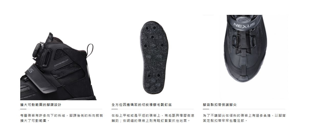 鞋型採用適合日本人寬而高的腳背,帶來自然貼合感。此外,M號BOA® Fit System旋鈕,結合粗鐵線,整體可牢牢束緊,並在腳背處採用固定黏扣帶,即使在前傾的礁岩上也不會對大腳趾造成負擔。透過將鞋底與中底加大,鞋子本身不容易碰撞到礁岩,提升本體的耐用性。防水性能方面採用DRYSHIELD+,提高防水耐久性能。請務必親自體驗看看提升戰鬥力後的NEXUS磯釣鞋。