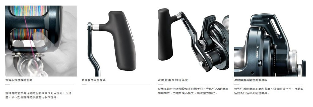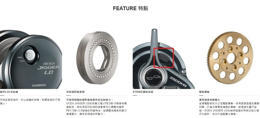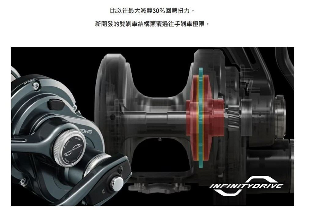 剎車扳板不只是用看的就能理解能將剎車的操控變得多便利,不易過熱的剎車性能最適合用於需要長時間搏魚的鮪魚作釣。剎車扳板在結構上只要剎車力調得越大,手把的捲動就越重,但藉由新開發的INFINITY DRIVE結構,可大幅降低高剎車力的捲動重量。搭載可應戰大型魚的NEW大型T型握丸,以及105mm冷間鍛造手把。好握持的框體形狀、講究操控性的剎車扳板等等,融合OCEA JIGGER系列各種技術特點所開發的剎車扳板捲線器。附帶能對應纖細釣線的釣線套筒。