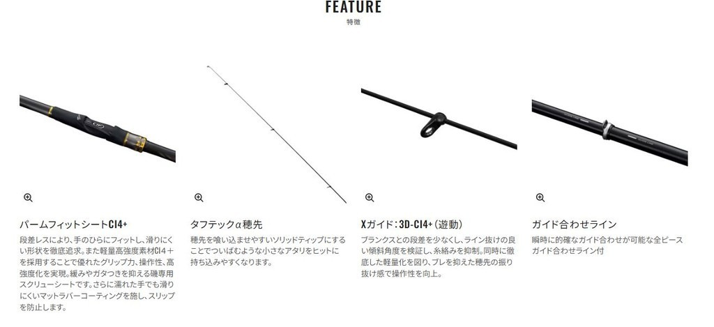 鱗海是一款適用軟餌的遠投性能竿,彈性的竿尾擁有絕佳的誘食性能。能阻擋黑鯛甩頭攻勢,實現柔韌搏魚的黑鯛釣專用竿。竿身採用抗扭曲、防斷裂的基本構造SPIRAL X。能正確設置導環的導環對準線,竿尾搭載了能夠實現柔韌纖細曲線的TAFTEC α。捲線器座搭載了容易握持、可以實現穩定操作及搏魚的人體工學捲線器座CI4+。此外,考慮到使用細線,採用防纏線塗裝Ⅱ,有助於防止在惡劣釣況下產生纏線。另外,捲線器座和手把節前端採用霧面橡膠塗裝,即使濕了手也不容易打滑。為了能享受黑鯛飄釣,無論釣者的水準如何,這些充實的裝備都能強力的支持釣魚的精準度。嚴選了7款,設想成日本全國的釣魚場所都適用的釣竿。越使用越上手,能成為您永遠使用的釣魚夥伴吧!